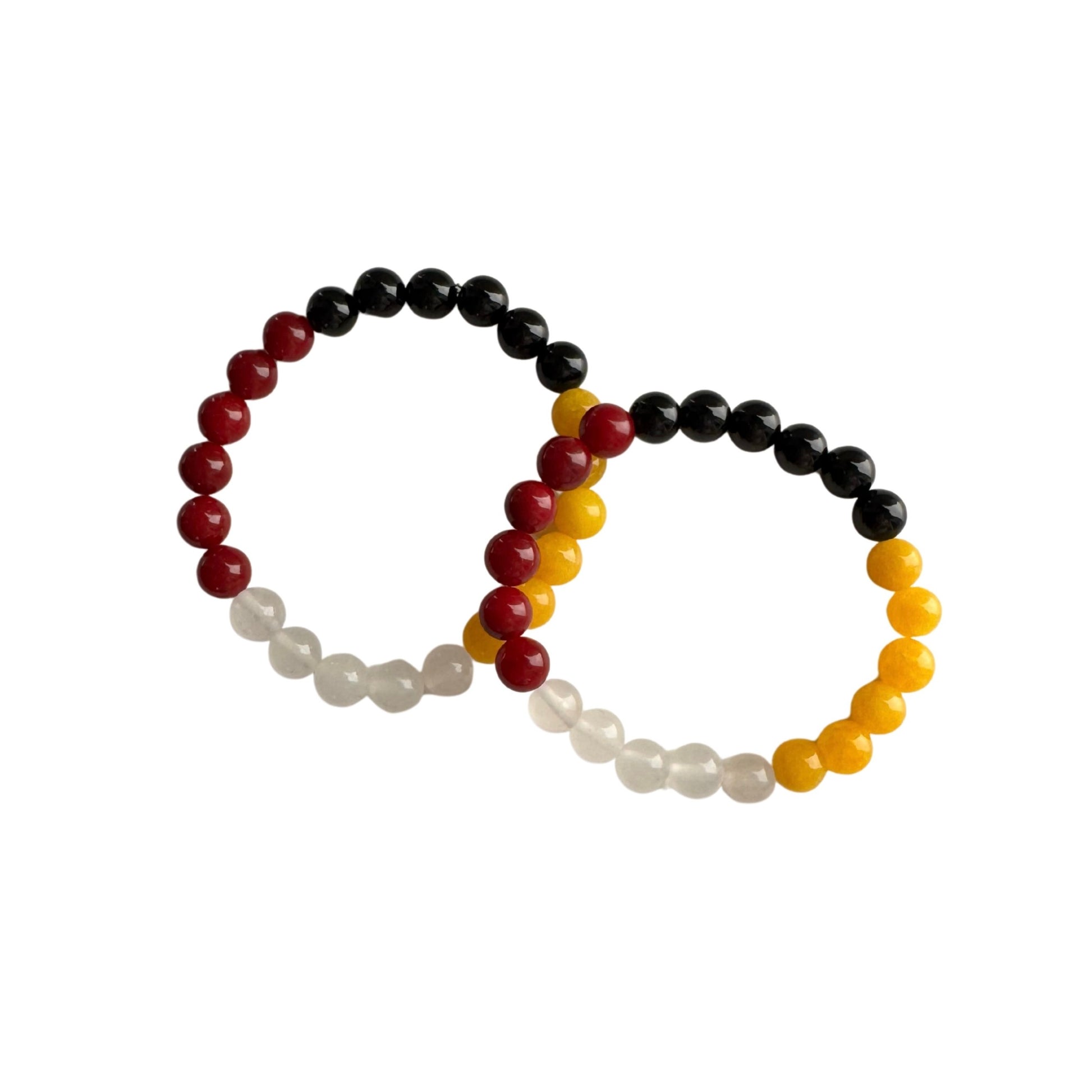 This bracelet is made with yellow jade, red jade, black onyx, white jade and stretchy elastic.